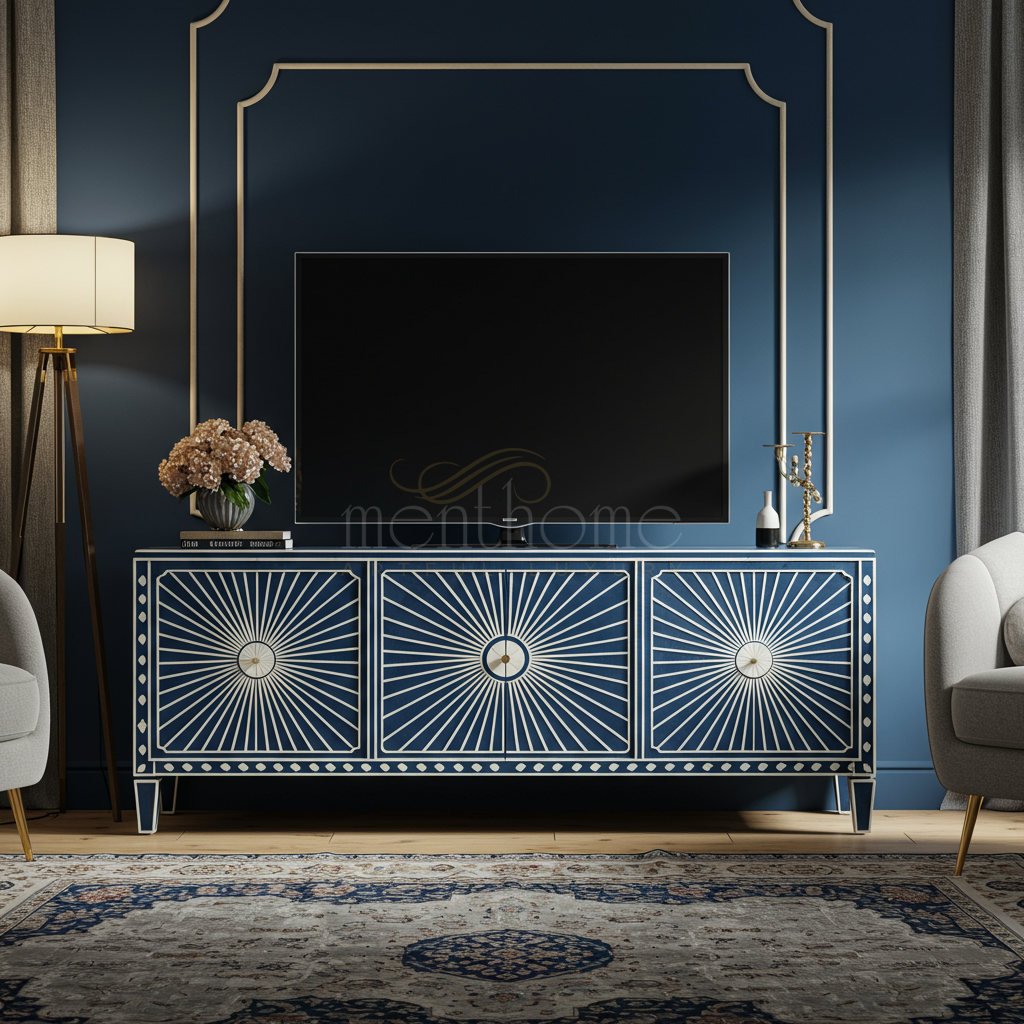 This elegant TV cabinet features a striking inlay sunburst design in white against a rich navy blue background, providing a perfect blend of classic luxury and modern style. Crafted with intricate detailing, it offers ample storage space with three spacious compartments, ideal for organizing media devices and accessories while serving as a stunning centerpiece for any living room.