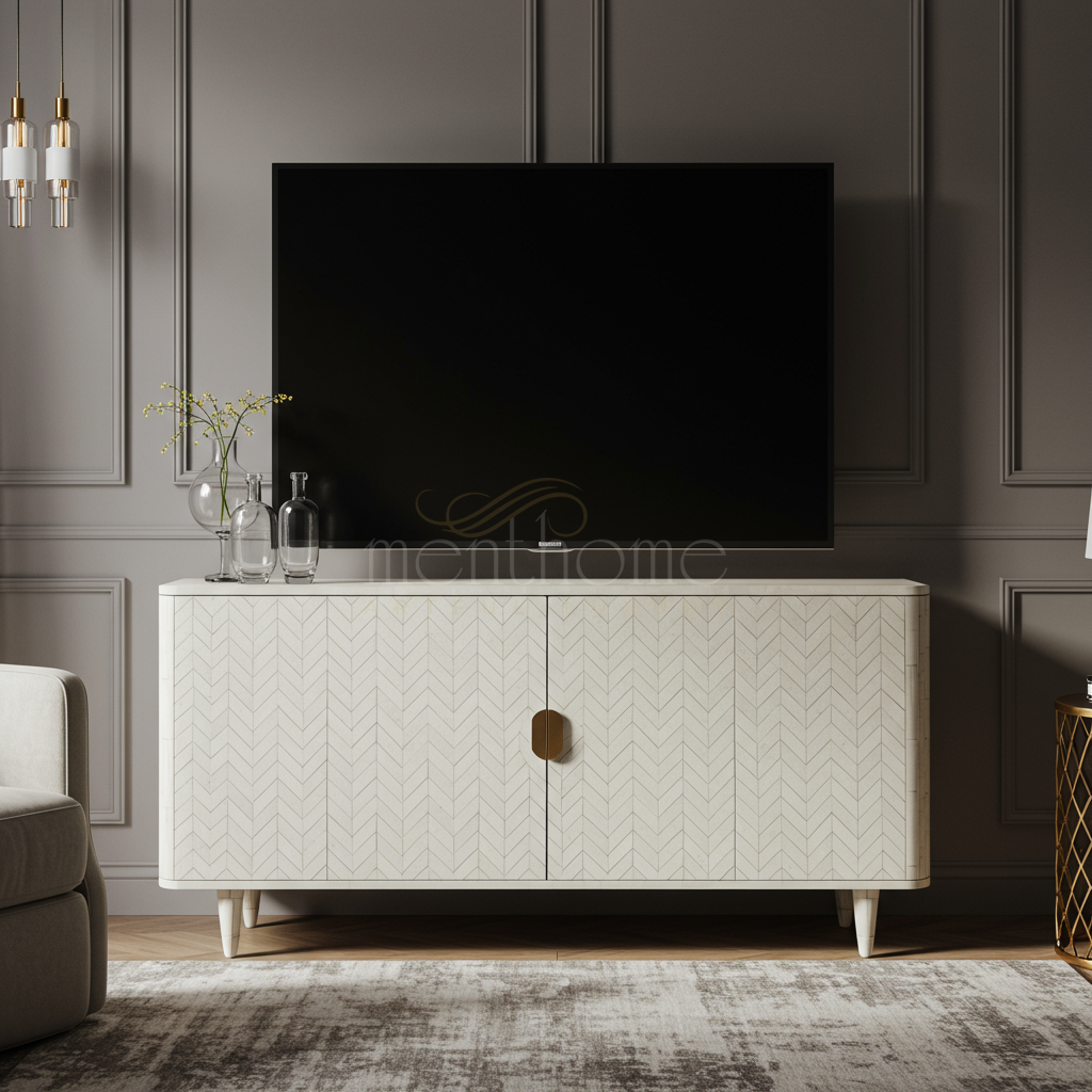 This elegant TV cabinet features a sophisticated inlay herringbone pattern on its doors, crafted with meticulous attention to detail. The cabinet is finished in a creamy white tone, complemented by a sleek brass handle at the center. Elevated on tapered legs, it offers both style and functionality, providing ample storage while enhancing modern living spaces.