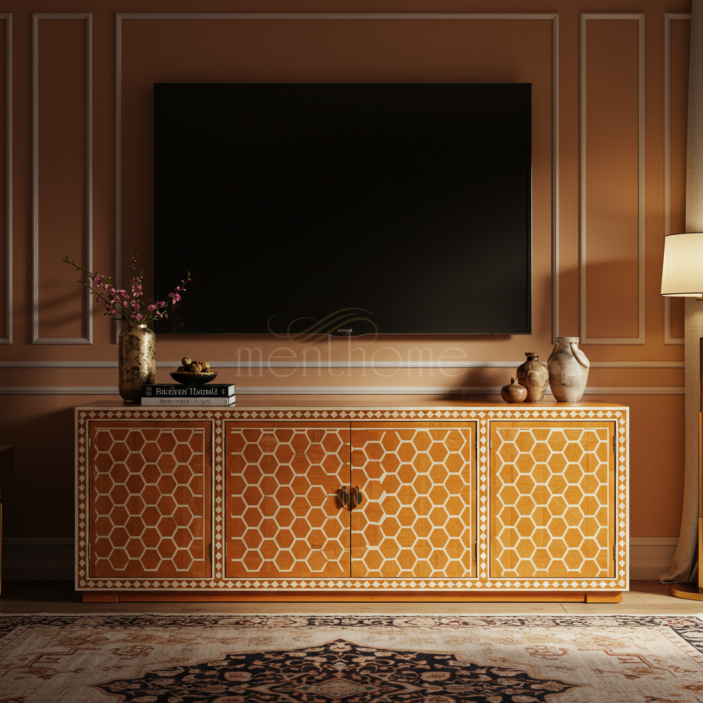 A sophisticated inlay-designed TV cabinet showcasing intricate geometric patterns. Crafted with premium wood and inlaid with contrasting materials, it combines artistry with functionality to elevate your living space.