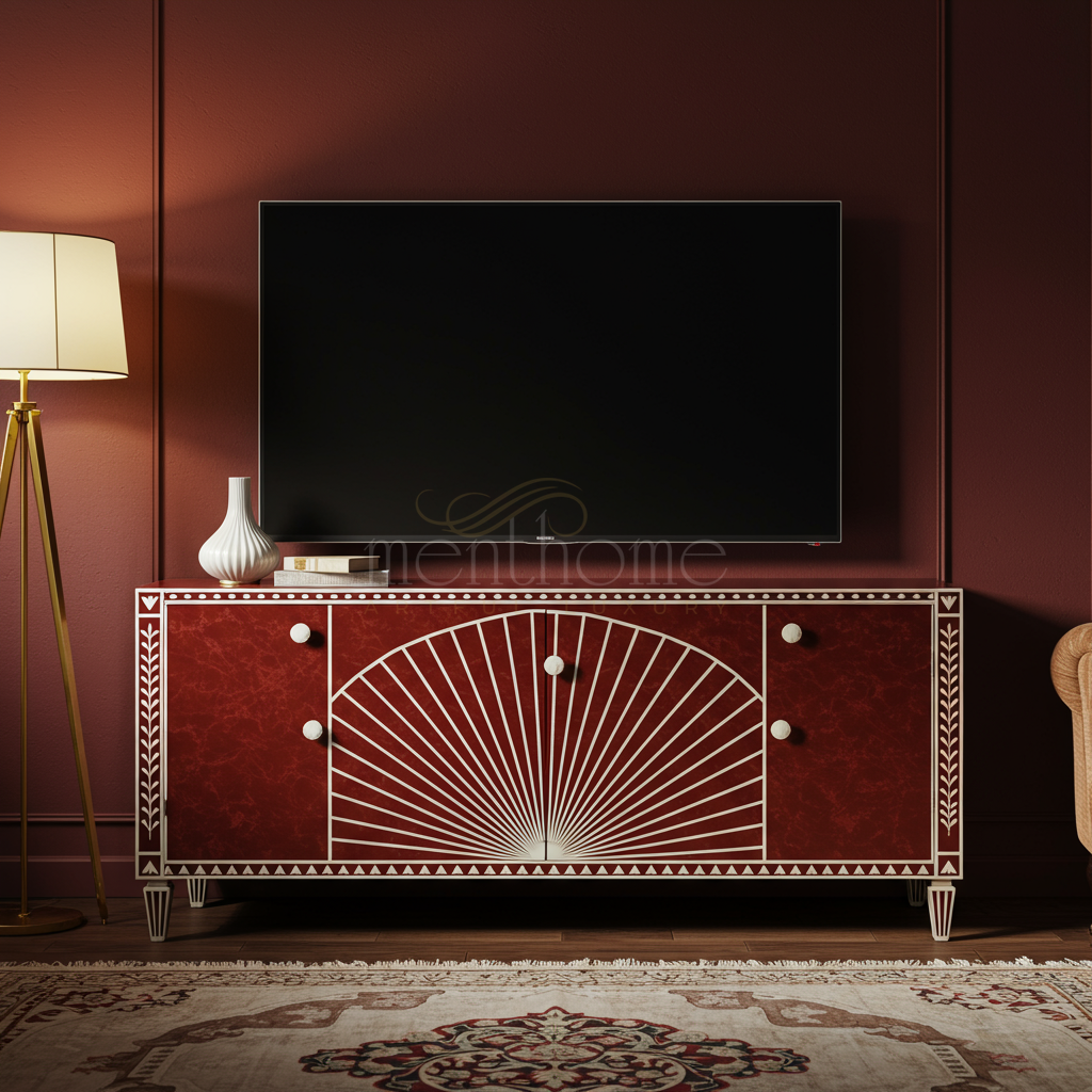 Luxury Inlay Red and White Geometric TV Cabinet | Luxury Handmade TV Cabinet
