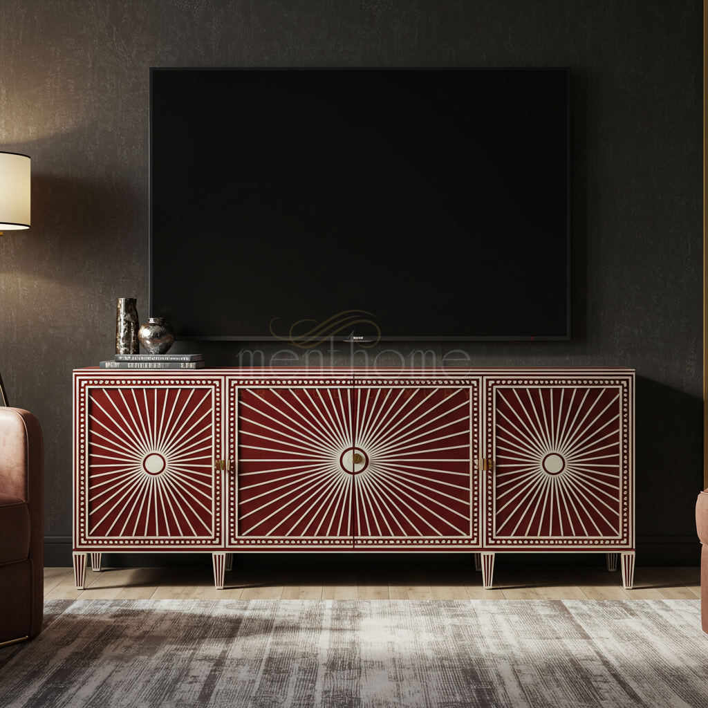An exquisite inlay TV cabinet featuring intricate sunburst patterns in a rich maroon and cream color palette. This luxurious piece blends traditional craftsmanship with modern design, providing ample storage while acting as a statement piece in any living room.