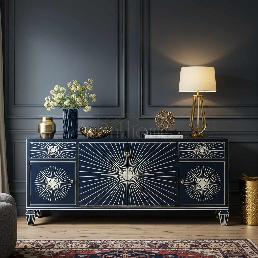 Luxury Inlay TV Cabinet in Navy Blue with Gold Sunburst Design | Luxury Handmade TV Cabinet