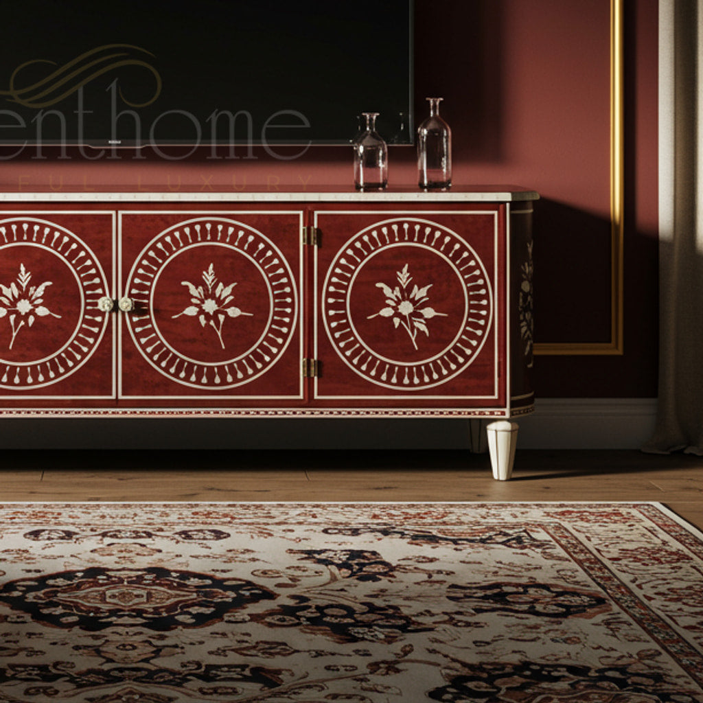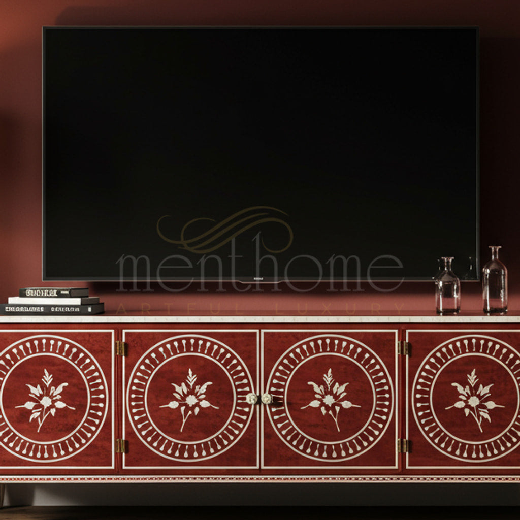A stunning luxury TV cabinet featuring detailed inlay work with elegant floral motifs. Finished in rich red tones with contrasting white inlay, this piece combines traditional craftsmanship with contemporary style, perfect for adding a sophisticated touch to any living room space.