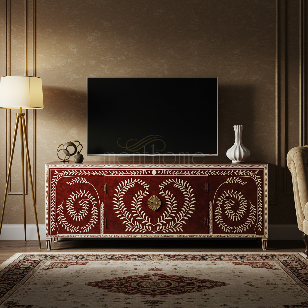 Luxury Inlay TV Cabinet with Handcrafted Floral Motifs | Luxury Handmade TV Cabinet