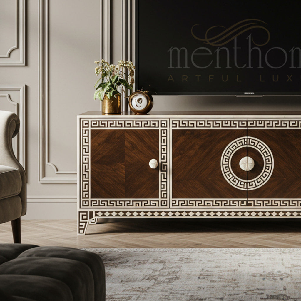 Luxury Inlay Wood TV Cabinet with Classic Greek Key Design | Luxury Handmade TV Cabinet