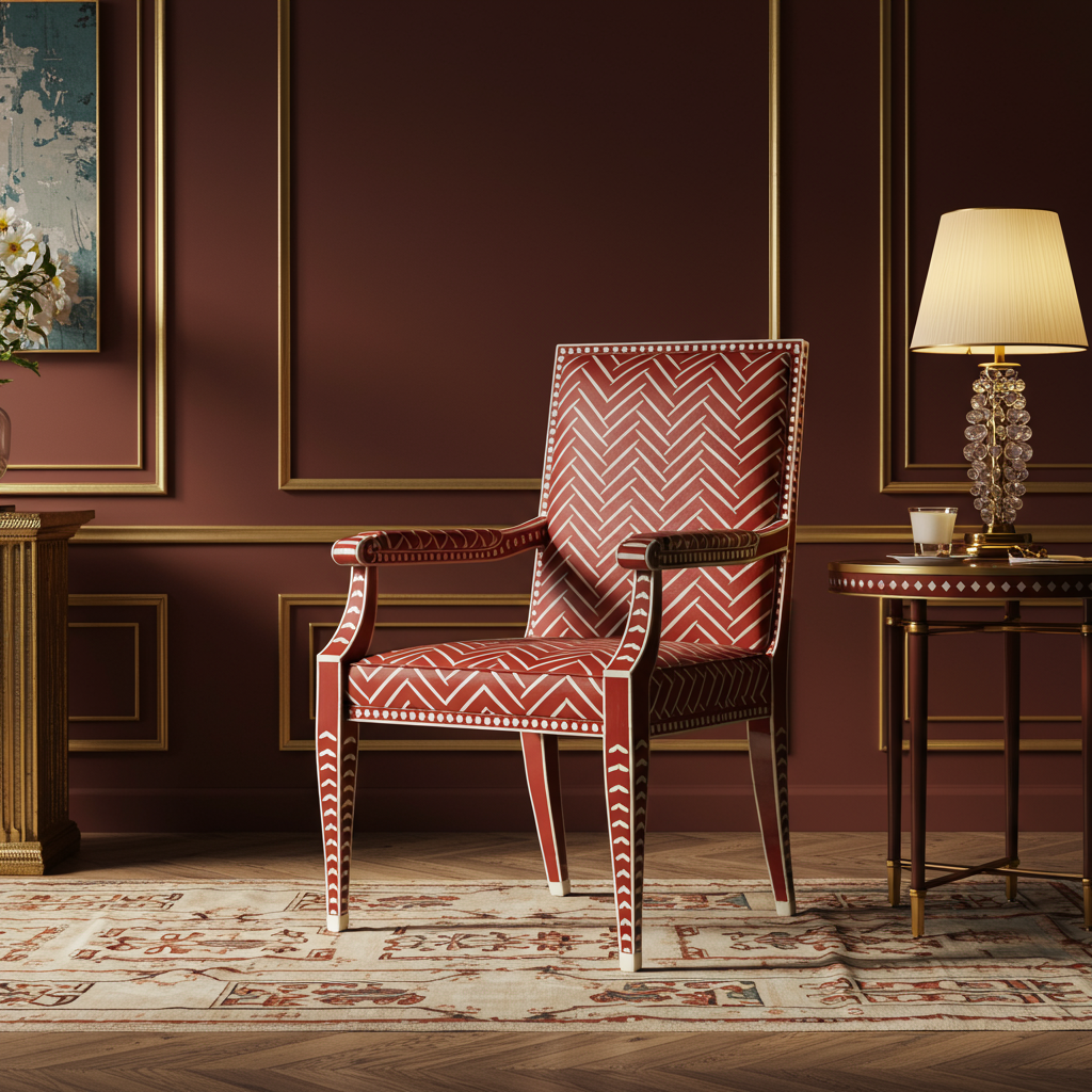 This exquisite Inlay Chair features a rich red finish with intricate white geometric inlay work throughout its frame and upholstered surfaces. Designed for both comfort and style, the chair boasts elegant armrests and a sturdy hardwood construction, making it a perfect statement piece for upscale living rooms or formal sitting areas.