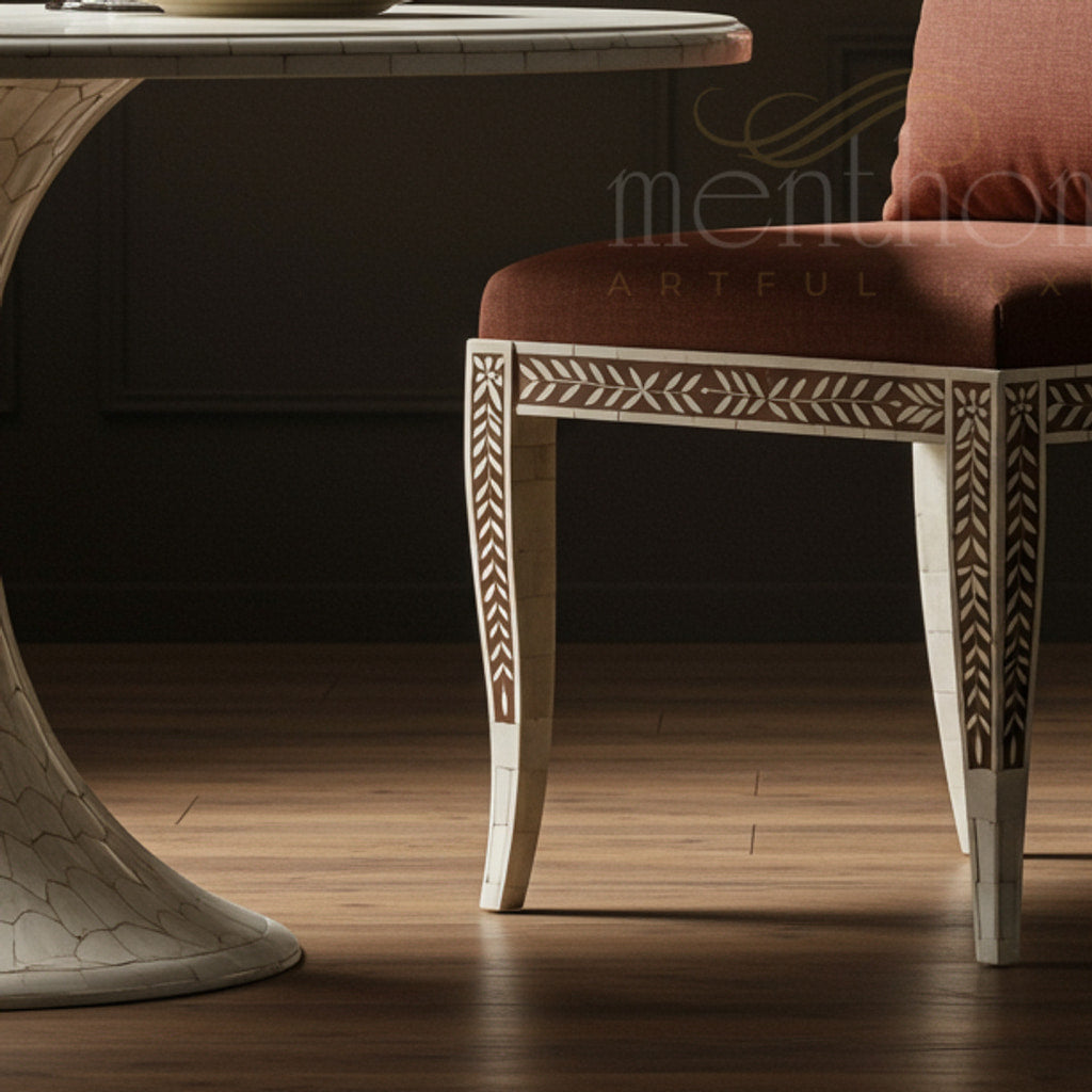 This exquisite Inlay Chair blends intricate hand-crafted wooden inlay detailing with a sophisticated botanical-patterned upholstery in warm terracotta tones. Designed for ultimate comfort and artistic elegance, this chair adds a refined touch to dining rooms or living spaces, marrying traditional craftsmanship with modern luxury.