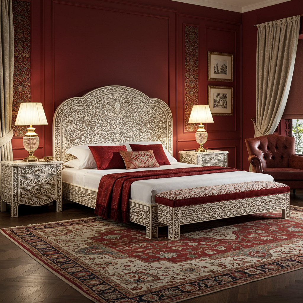 Exquisite king-size bed set featuring intricately handcrafted bone inlay with traditional floral and geometric patterns. This luxurious set includes a large arched headboard, matching nightstands, and a cushioned bench, all finished in elegant cream and dark accents. Perfect for adding a regal touch to your master bedroom with its vintage charm and detailed craftsmanship.