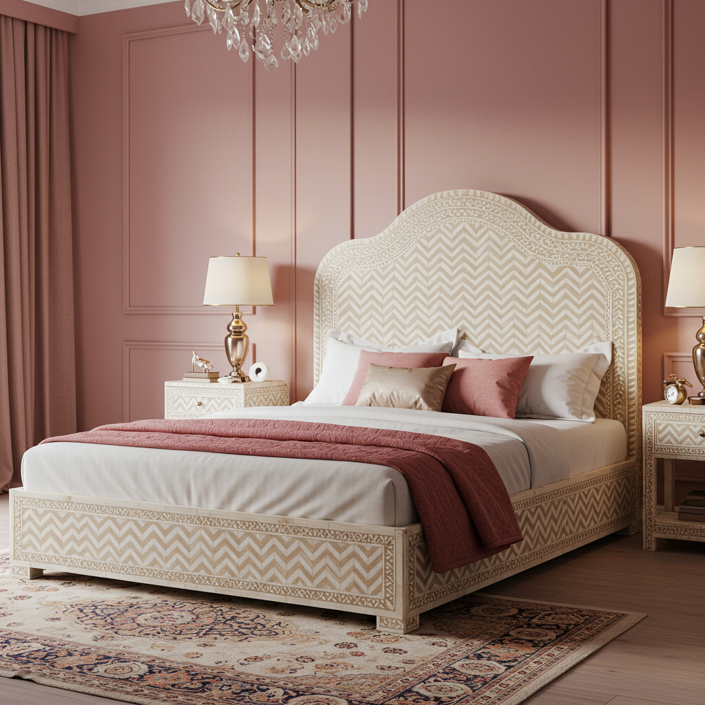 This exquisite king-sized bed features a beautifully curved headboard and footboard adorned with intricate ivory patterned detailing. The craftsmanship and elegant design blend traditional beauty with modern comfort, making it the perfect centerpiece for a stylish and inviting bedroom.