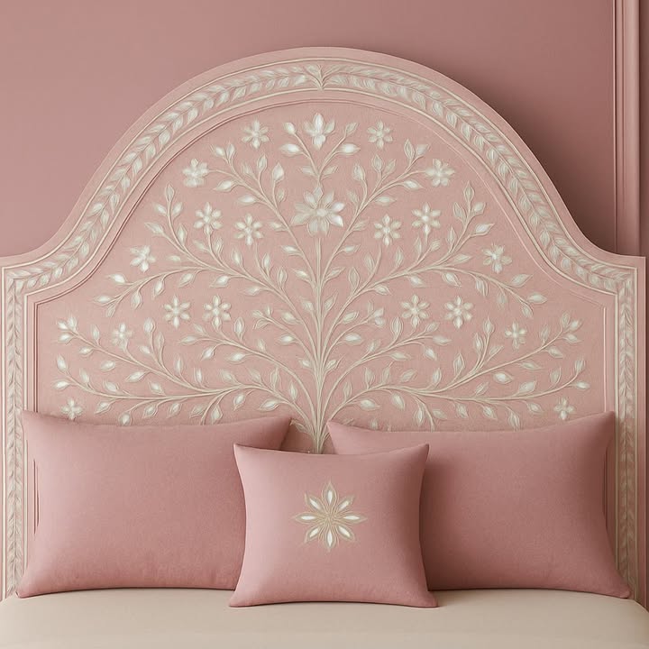 - Handcrafted king-size bed frame with detailed inlaid wood design