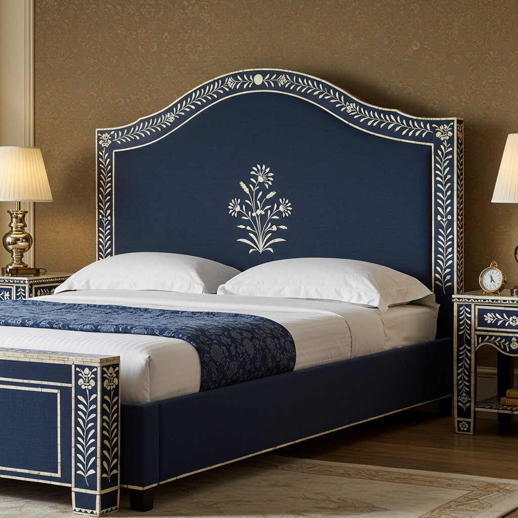 Luxury Navy Blue Upholstered Bed with Intricate Floral Inlay