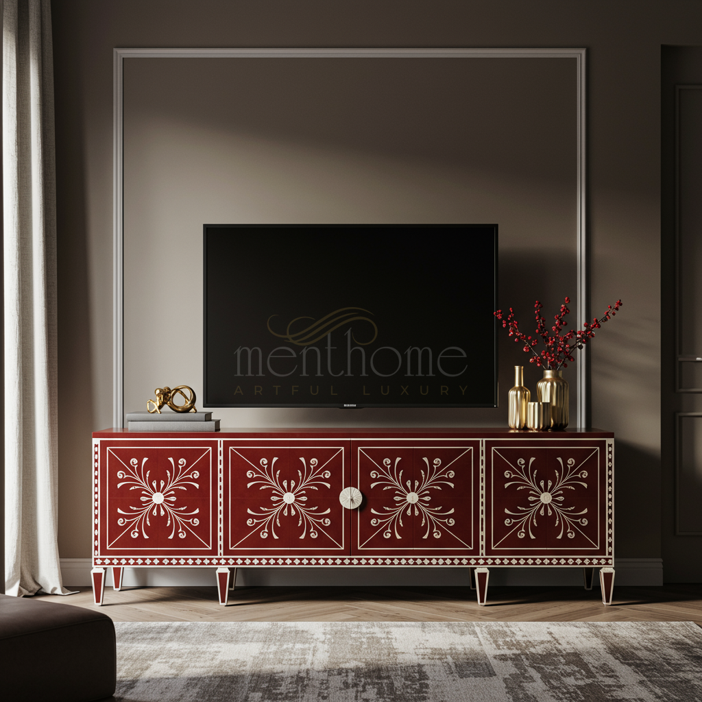 Luxury Red Inlay TV Cabinet with Floral Motifs | Luxury Handmade TV Cabinet