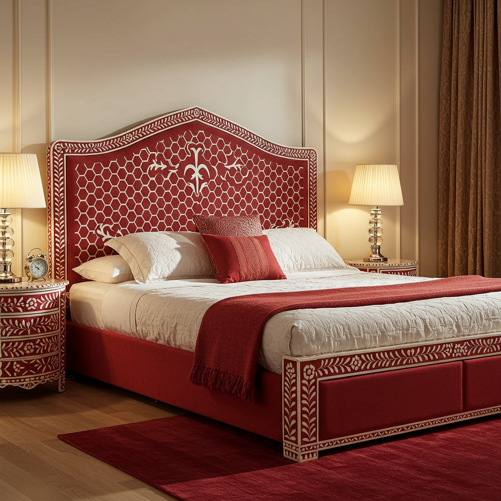 This luxurious queen-sized bed features a rich red upholstery complemented by an exquisite bone inlay design on the headboard and footboard. The elegant craftsmanship and intricate patterns add a sophisticated touch to any bedroom, blending traditional artistry with modern comfort. Perfect for those who appreciate distinctive, high-end furniture pieces.