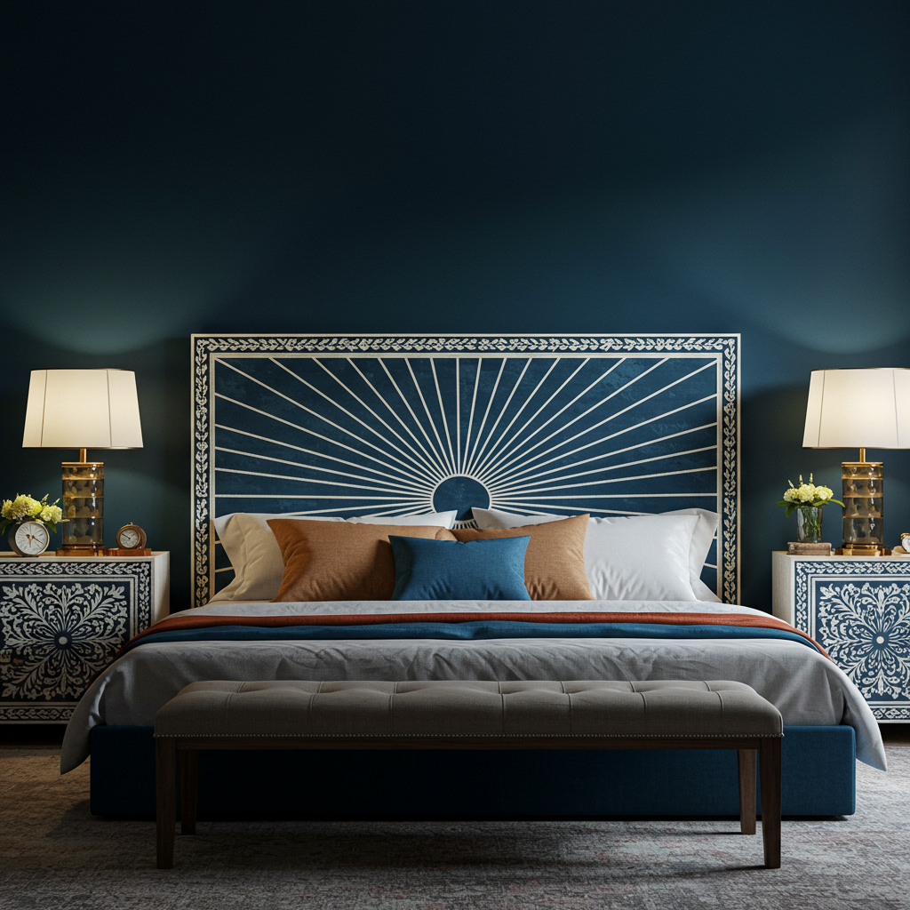 - King-size bed with elegant sunburst inlay design