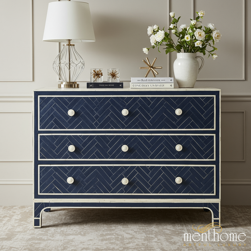 Navy Blue Chevron Pattern 3-Drawer Chest | Luxury Handmade Chest of Drawer