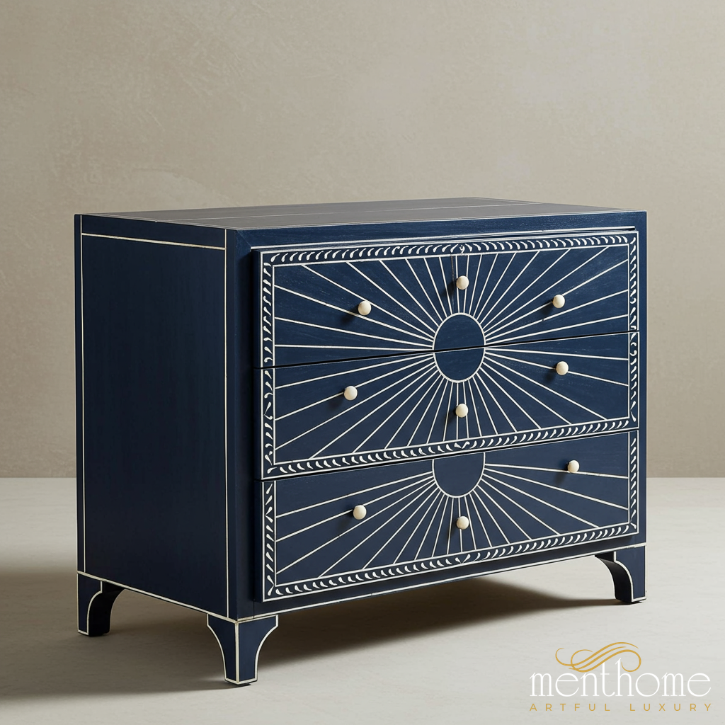 Navy Blue Sunburst 3-Drawer Chest | Luxury Handmade Chest of Drawer