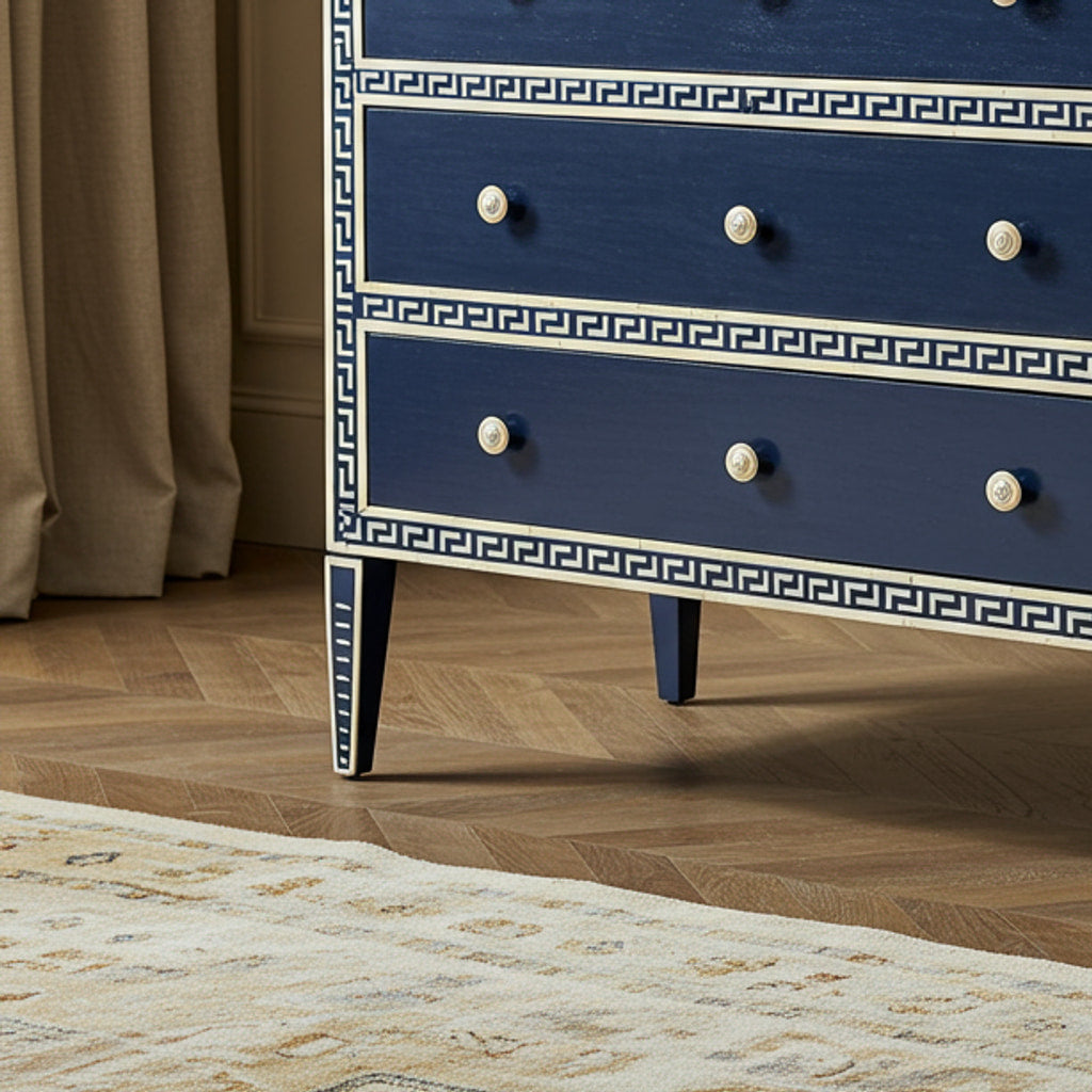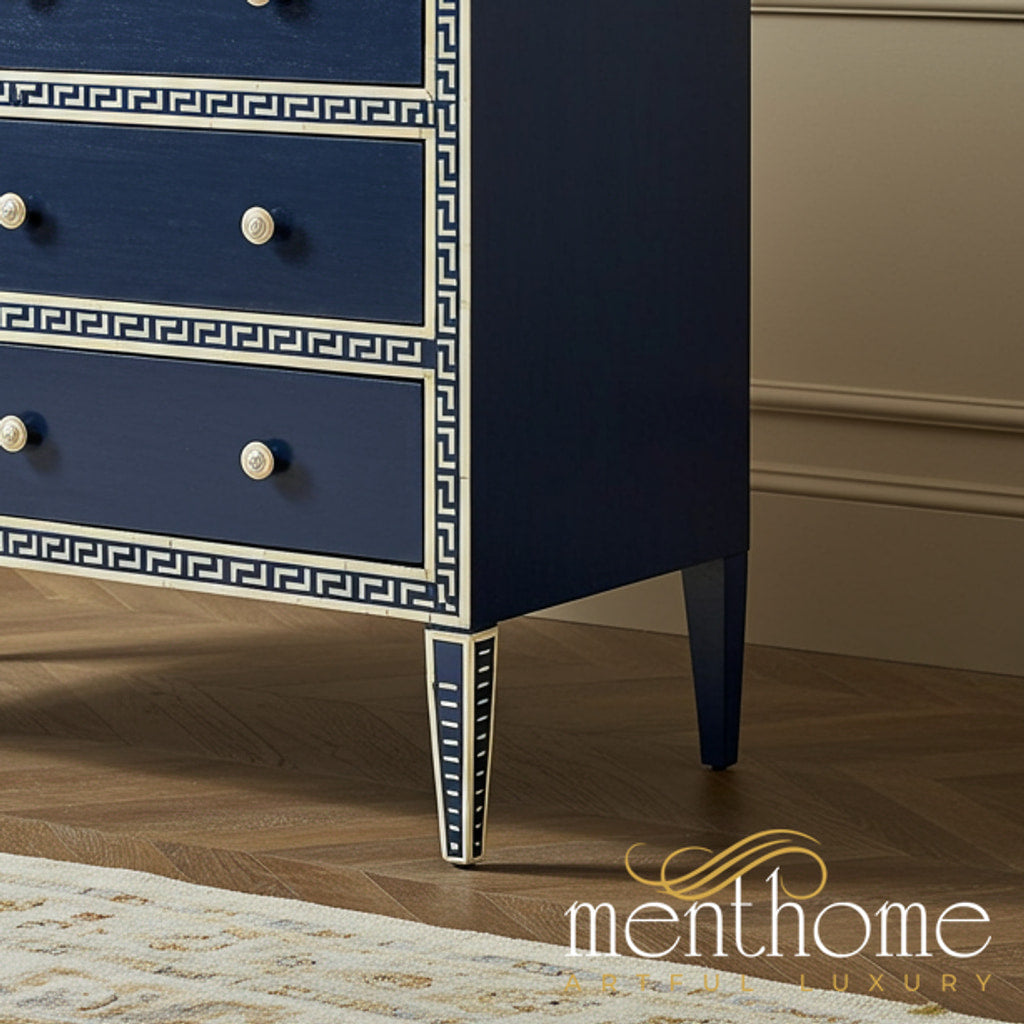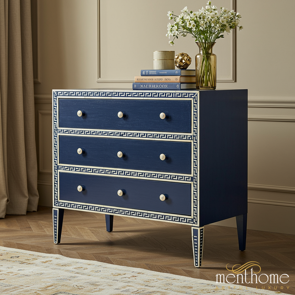 Navy Blue Three-Drawer Chest with Greek Key Detailing | Luxury Handmade Chest of Drawer