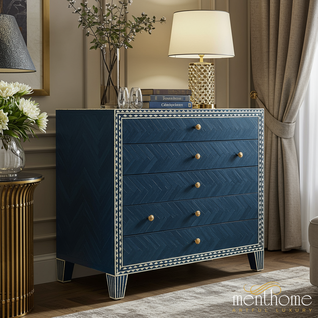 Navy Blue Wooden Chest of Drawers with Ivory Inlay | Luxury Handmade Chest of Drawer