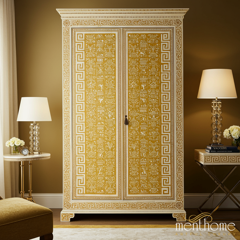 A stunning hand-painted armoire featuring intricate Greek Revival patterns in gold and white. This elegant storage piece offers both beauty and functionality, perfect for adding a classic touch to your living space.
