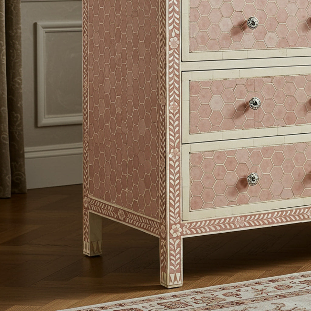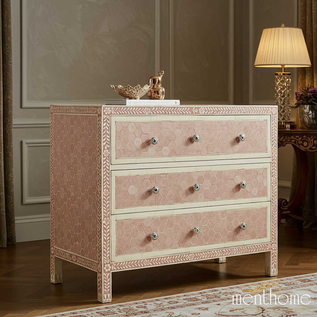 Pink Bone Inlay Hexagon Pattern 3-Drawer Dresser | Luxury Handmade Chest of Drawer