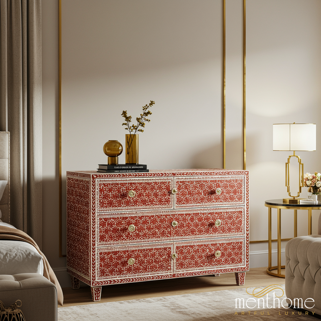A beautifully crafted wooden chest of drawers featuring an intricate red and white patterned design. The chest offers multiple drawers with elegant brass knobs, providing ample storage while serving as a striking decorative piece in any room.