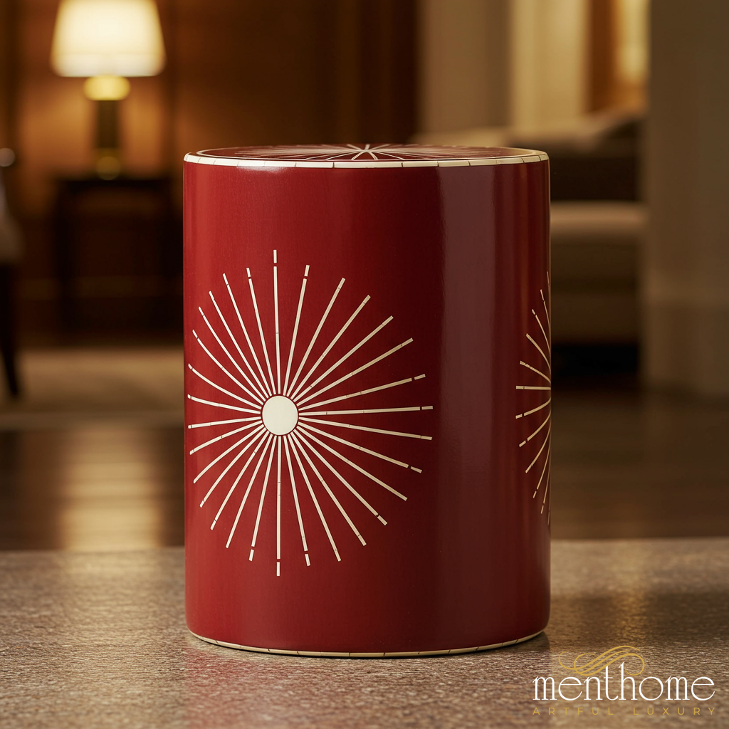 Red inlay Decorative Stool with Sunburst Pattern | Luxury Handmade Stool