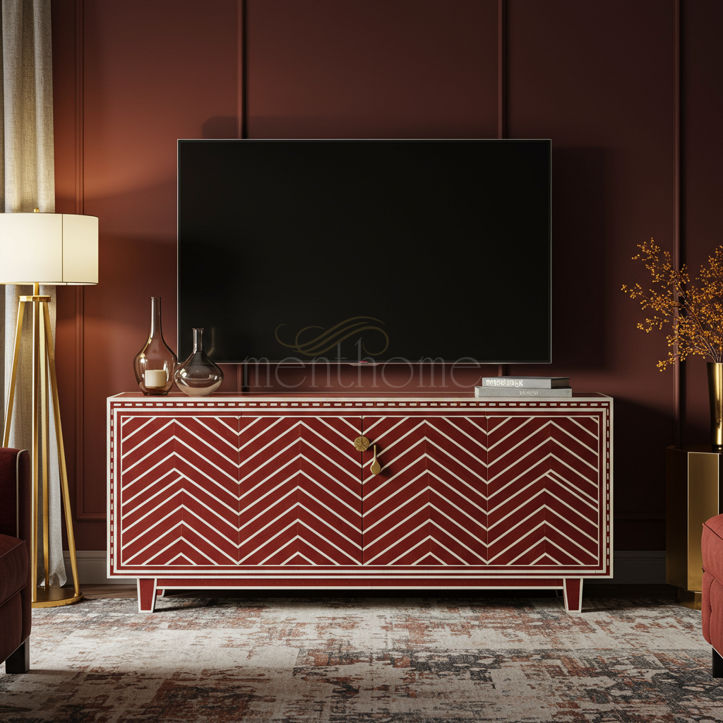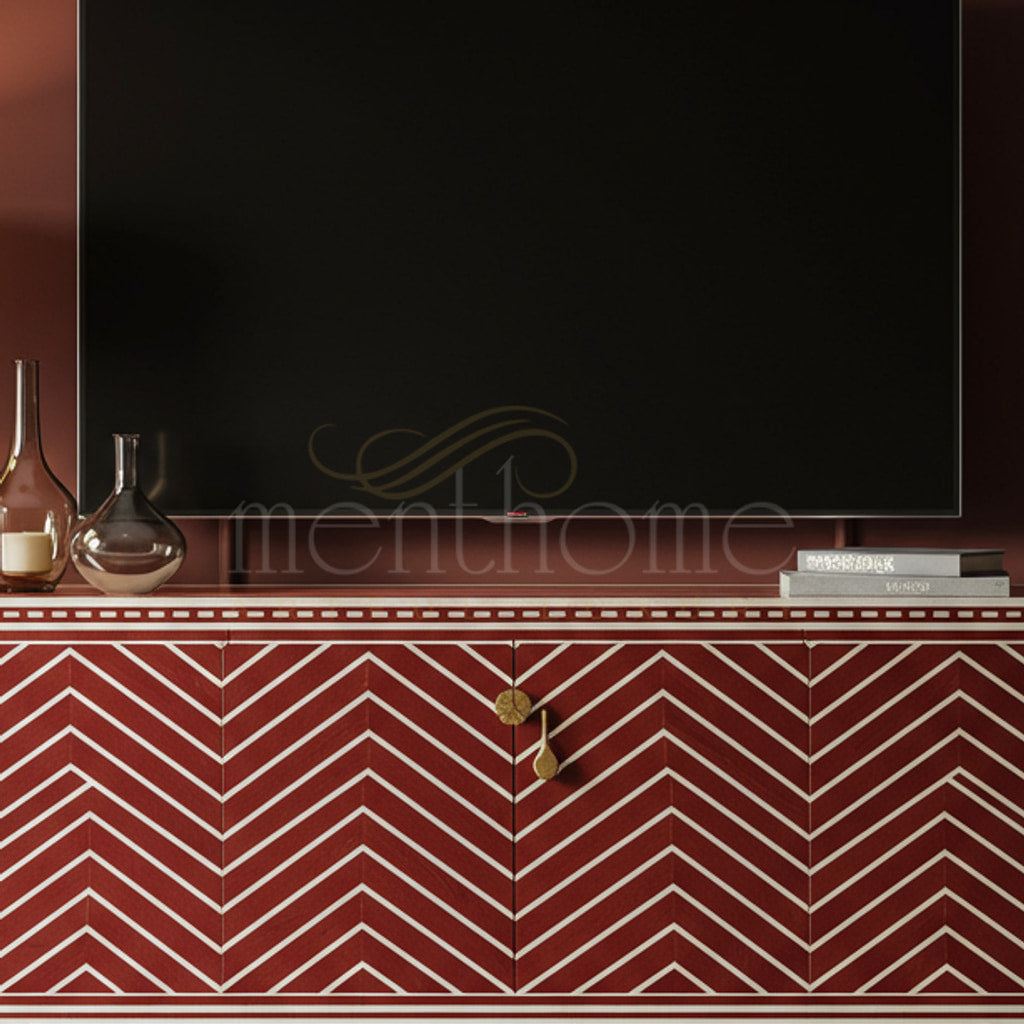 This elegant TV cabinet features intricate chevron inlay patterns in contrasting white on a rich red base, creating a striking focal point for any living room. Crafted with precision, it offers ample storage with its sleek design and sophisticated touches such as brass leaf-shaped handles. Perfect for blending luxury with functionality in your entertainment area.