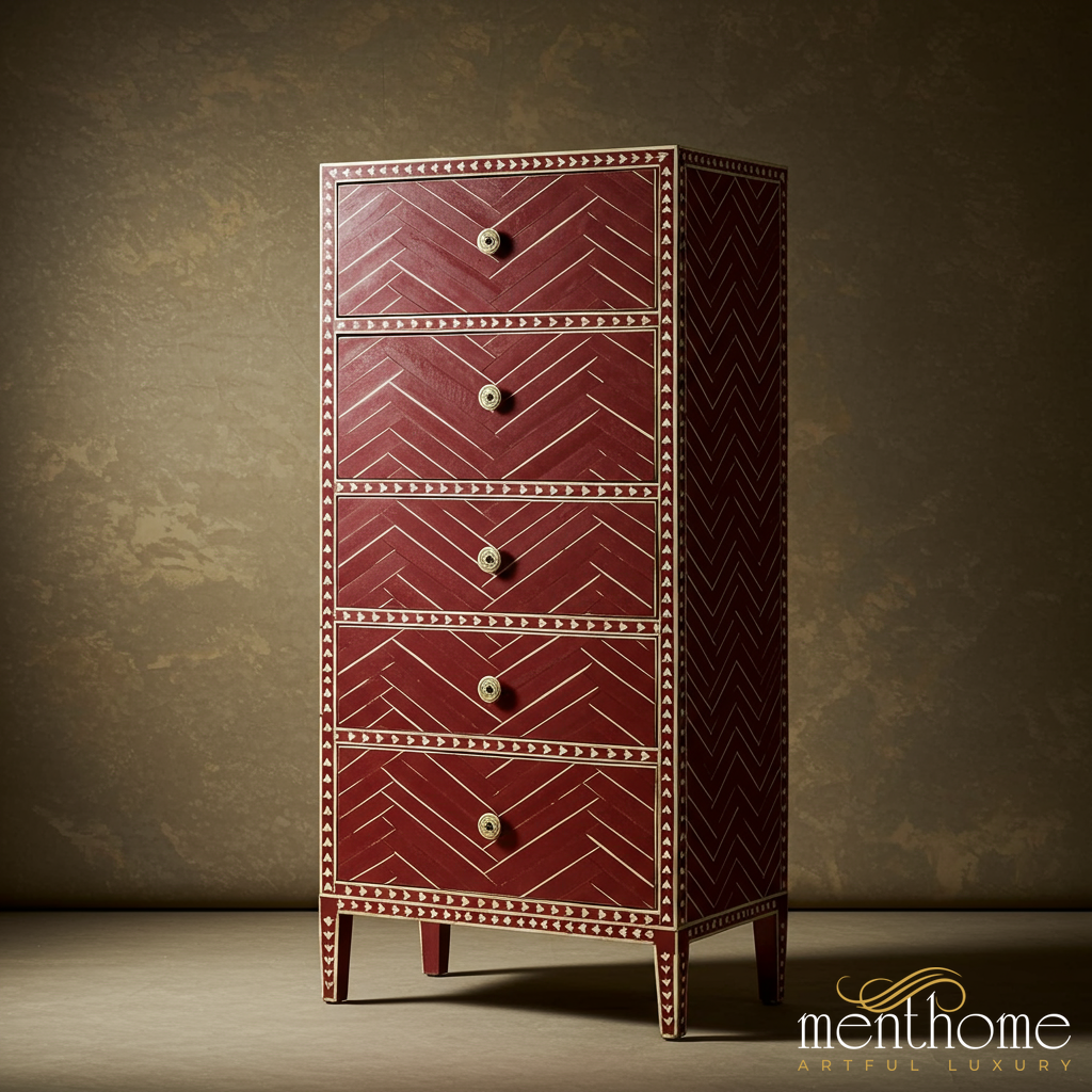 A tall and elegant chest of drawers featuring five spacious drawers, crafted from wood with a rich red finish. The surface is adorned with intricate geometric inlay patterns in a contrasting light tone, adding a distinctive decorative touch. Each drawer is equipped with a round, ornate metal knob for easy access. This piece combines functionality and artistic design, perfect for organizing personal items while enhancing room decor.