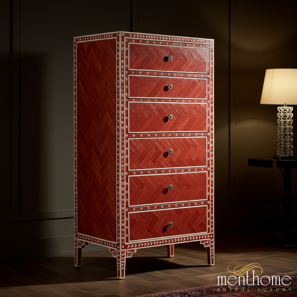 Red Wooden Tall Chest of Drawers with Inlay Design | Luxury Handmade Tallboy