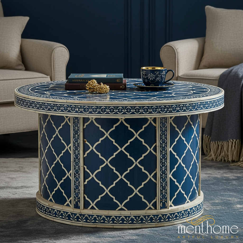 A beautifully crafted round coffee table featuring an intricate blue and white geometric pattern. This elegant table serves as a stylish centerpiece in any living room, perfect for holding books, beverages, or decorative items.