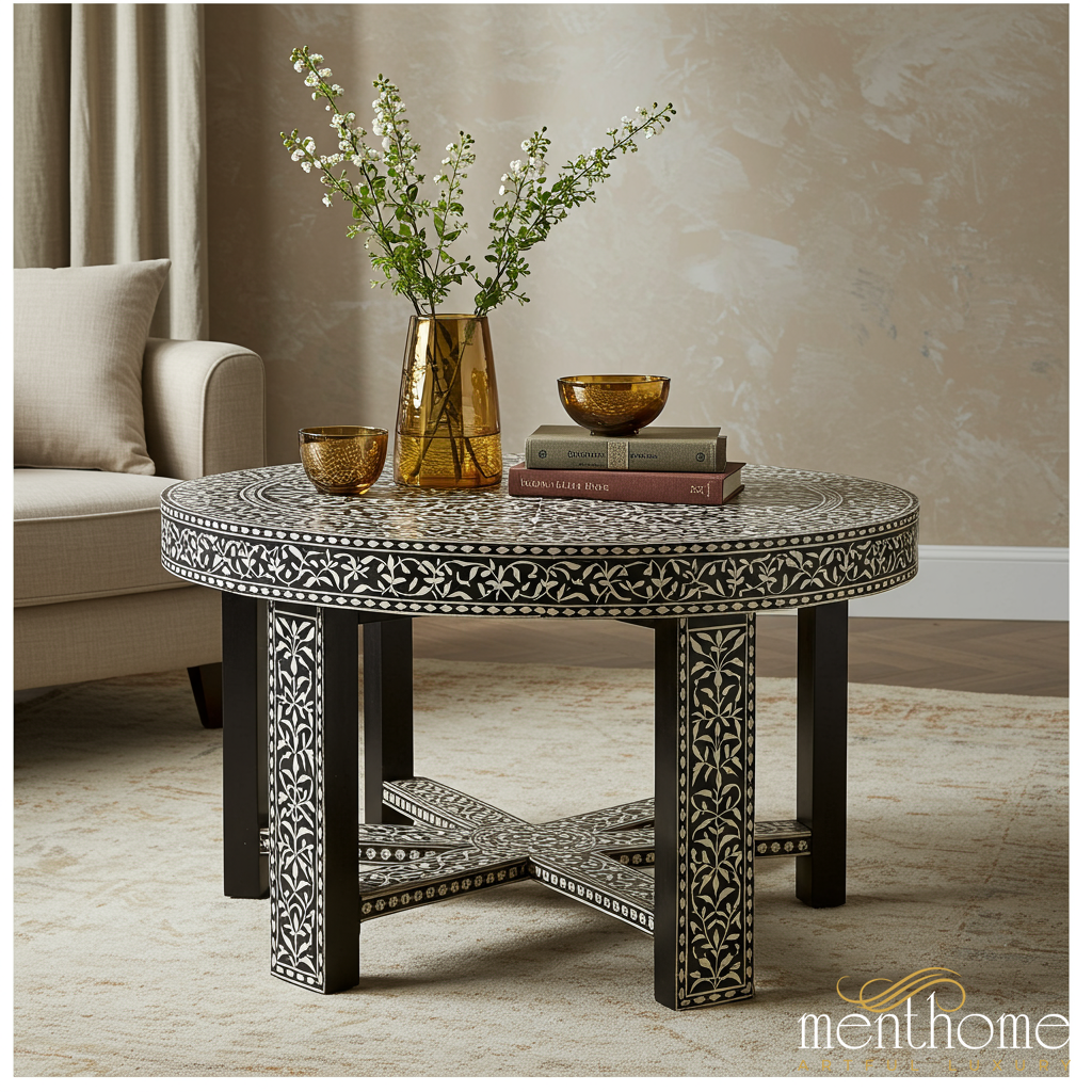 Round Bone Inlay Coffee Table with Floral Design | Luxury Handmade Coffee Table