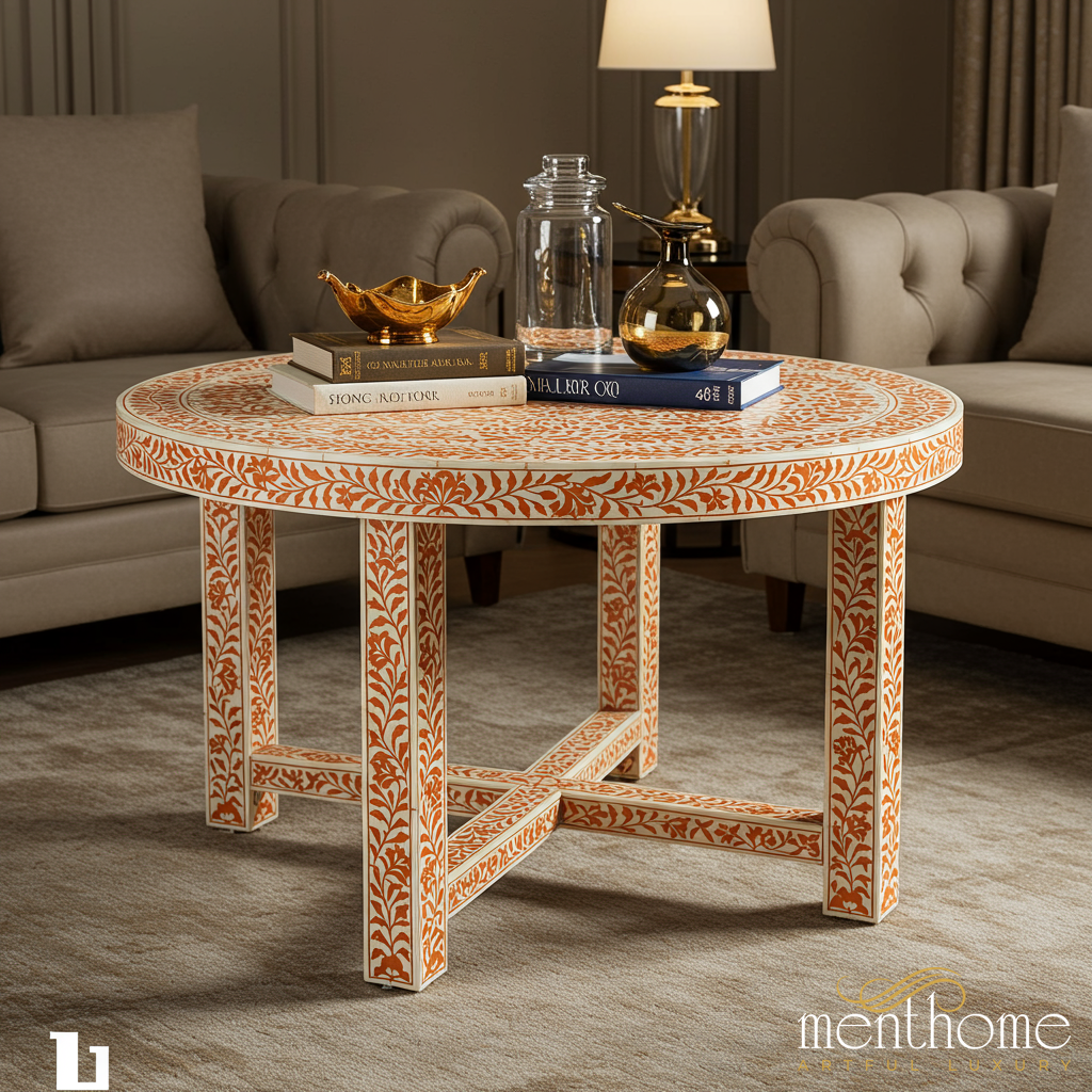A beautifully crafted round coffee table featuring intricate orange floral patterns inlaid into a white bone and wood surface. This table offers both elegance and functionality, perfect for adding a touch of sophistication to your living room or lounge area.