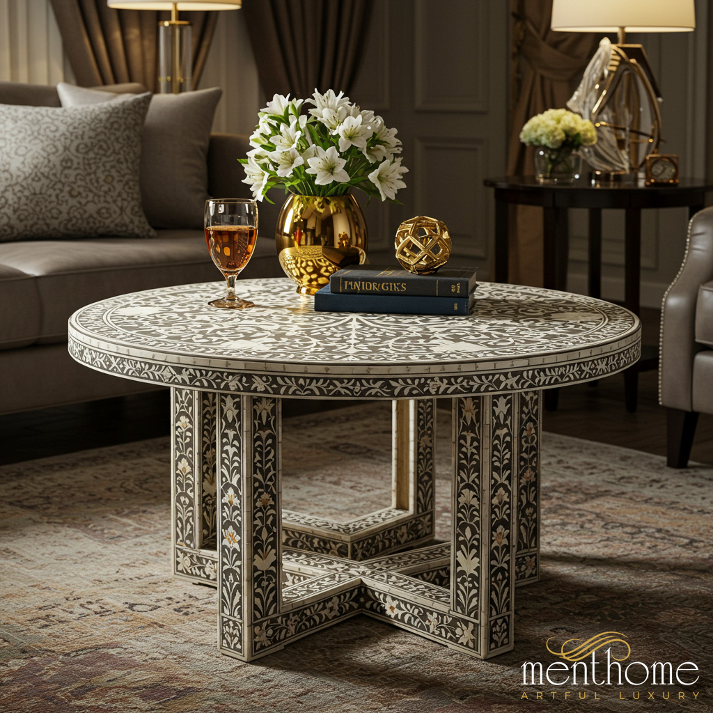 A beautifully crafted round coffee table featuring intricate bone inlay work with floral and vine patterns. The table combines elegance with functionality, suited for any living room setup.