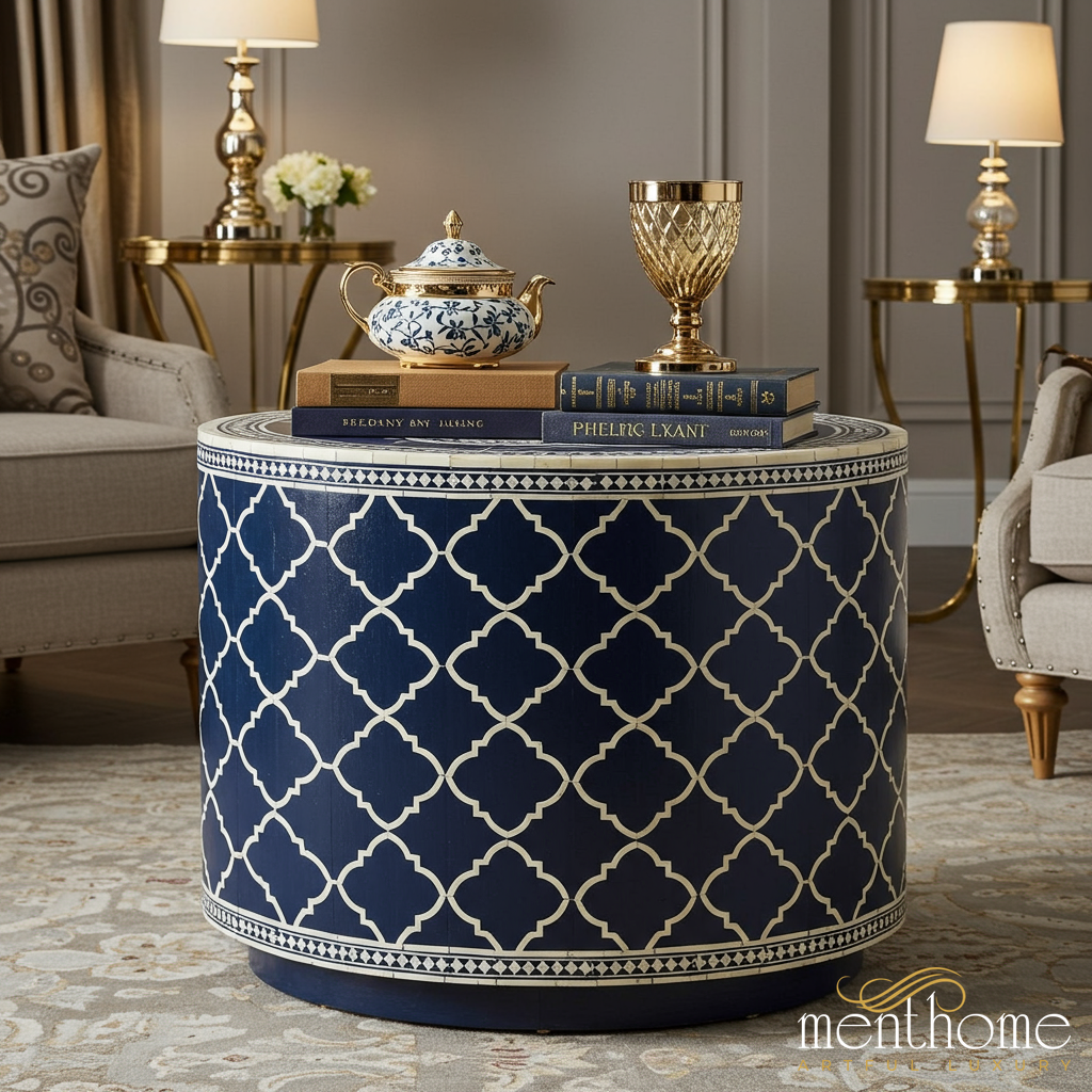 Round Navy Blue Patterned Accent Table | Luxury Handmade Coffee Table