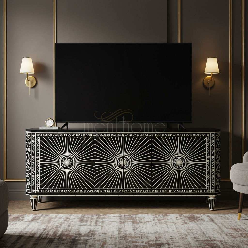 This luxury TV cabinet features an exquisite sunburst inlay design crafted in contrasting black and ivory tones. The intricate floral border and linear sunray patterns give it a sophisticated and timeless look, perfect for enhancing elegant living spaces. The cabinet combines artistry with functionality, providing ample storage behind three doors supported by beautifully tapered legs.