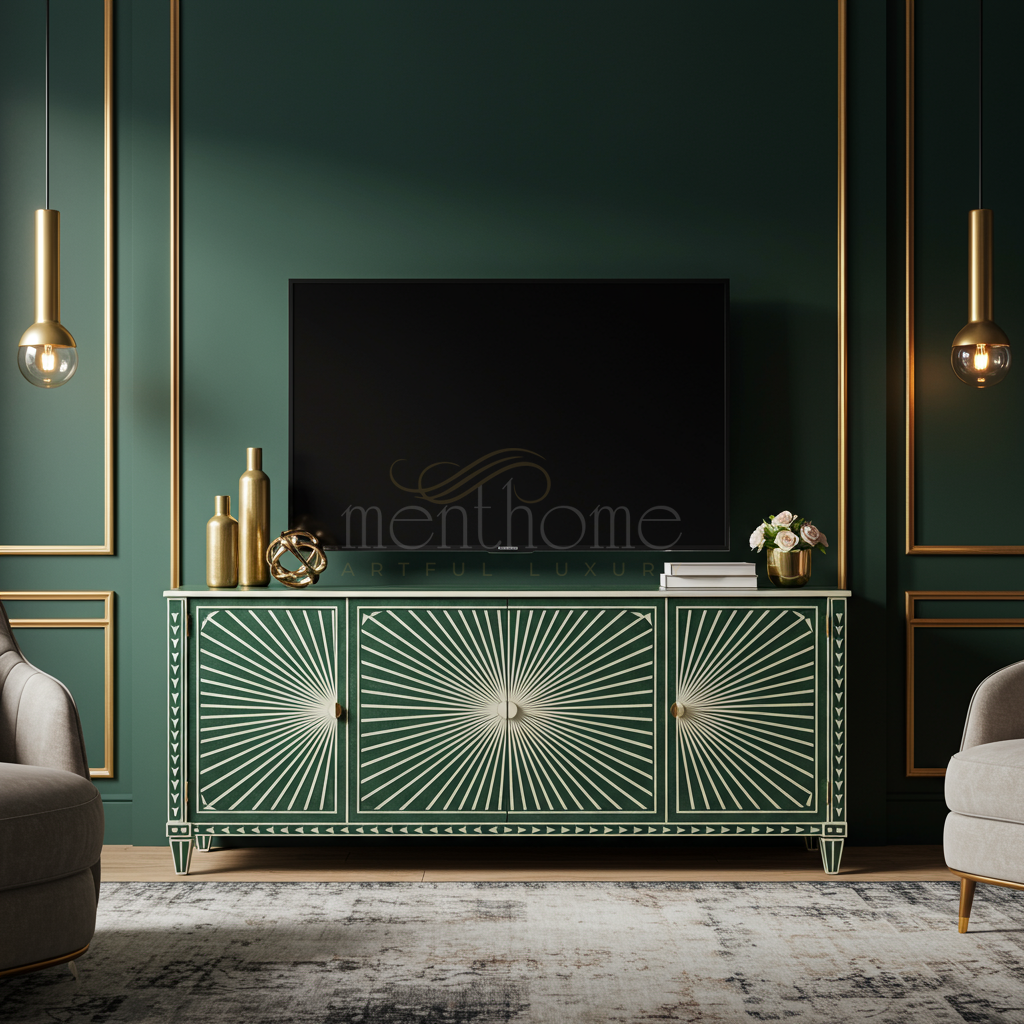A luxurious and meticulously crafted TV cabinet featuring a striking sunburst inlay design. Painted in deep forest green with delicate gold accents, this cabinet combines timeless elegance with functional storage. The piece is perfect for enhancing any sophisticated living room or entertainment area.