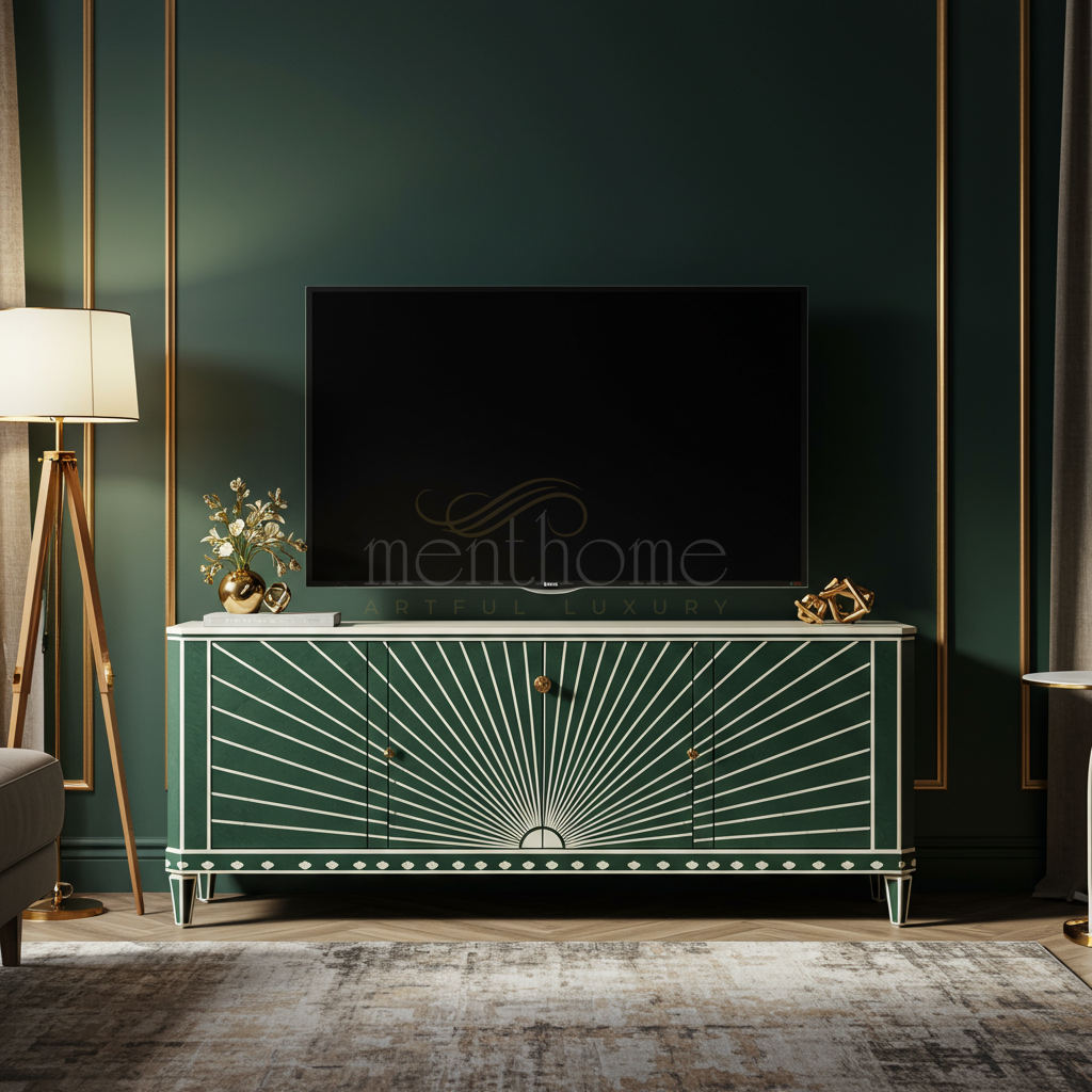 A luxurious TV cabinet featuring an elegant sunburst inlay design in white against a rich emerald green background. This statement piece combines sophisticated craftsmanship with practical storage solutions, perfect for adding a refined touch to your living room.