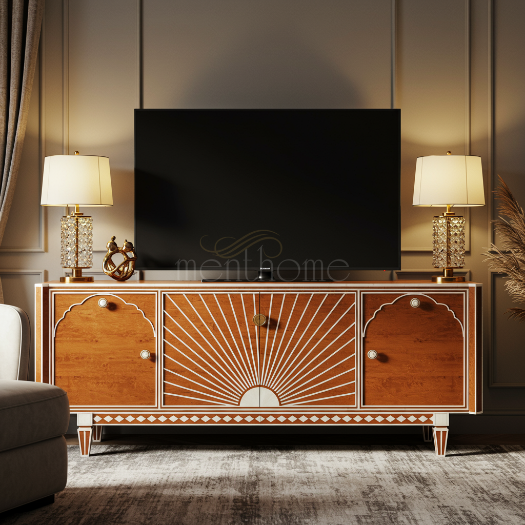 Sunburst Inlay Wood TV Cabinet | Luxury Handmade TV Cabinet