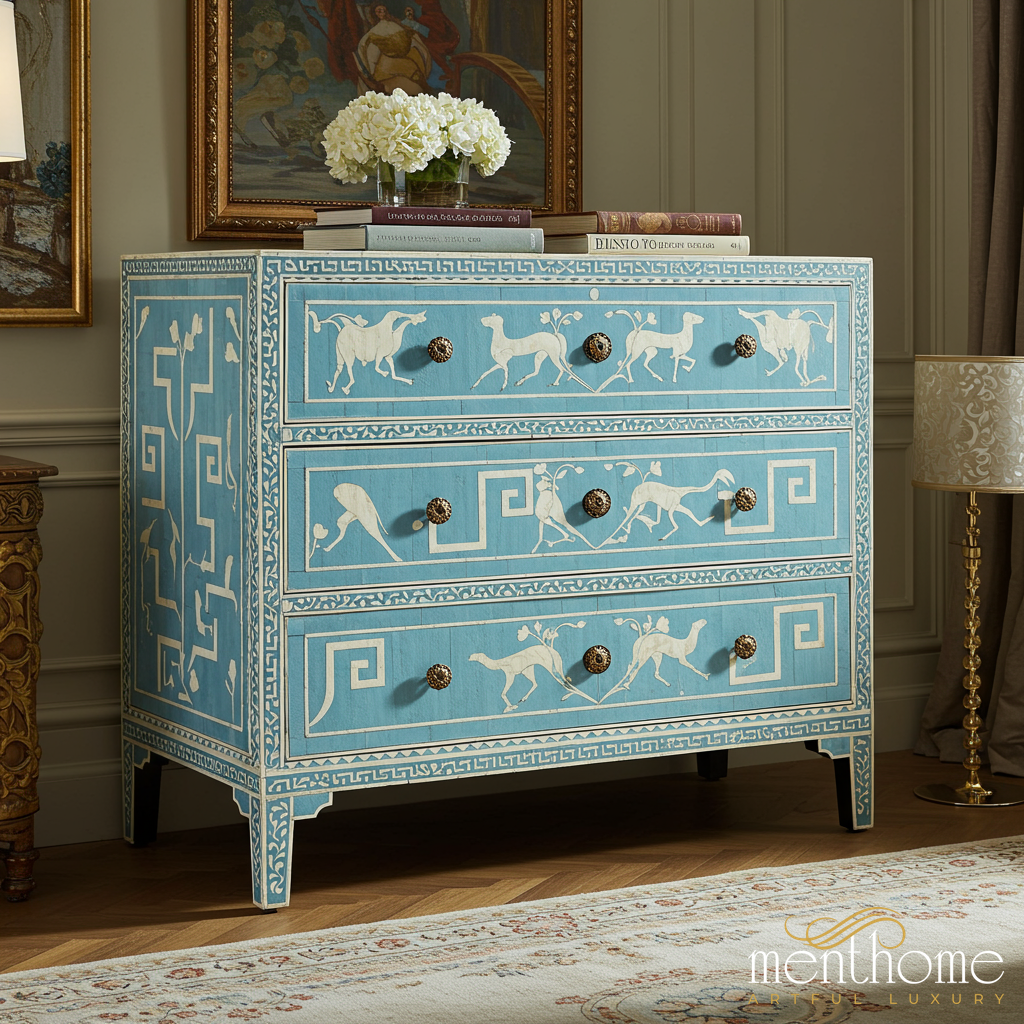 A beautifully crafted vintage chest of drawers featuring a vibrant blue finish adorned with elegant white dog motifs and intricate border patterns. This piece combines functionality with artistic charm, perfect for adding a unique touch to any room.