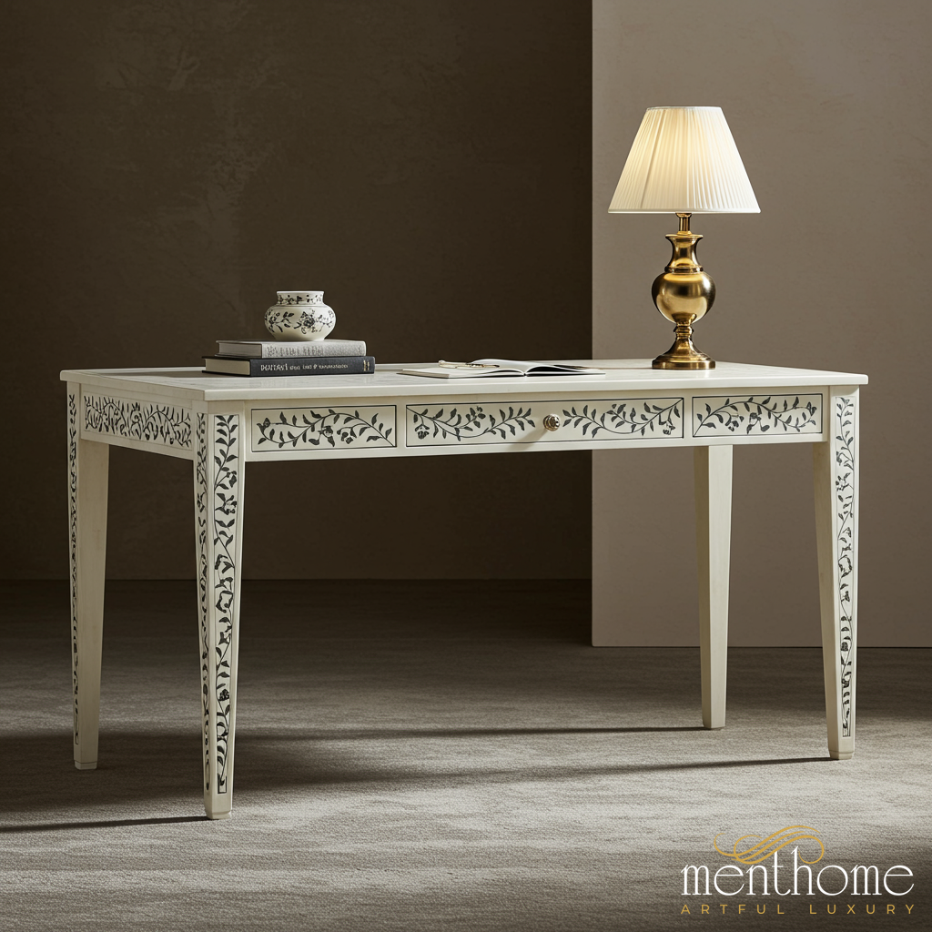 Elegantly crafted vintage wooden desk adorned with hand-painted black floral vine patterns on cream-colored surface. Features three front drawers with classic knob handles, providing practical storage while adding a timeless aesthetic. Perfect for home offices, study rooms, or stylish interior decor.