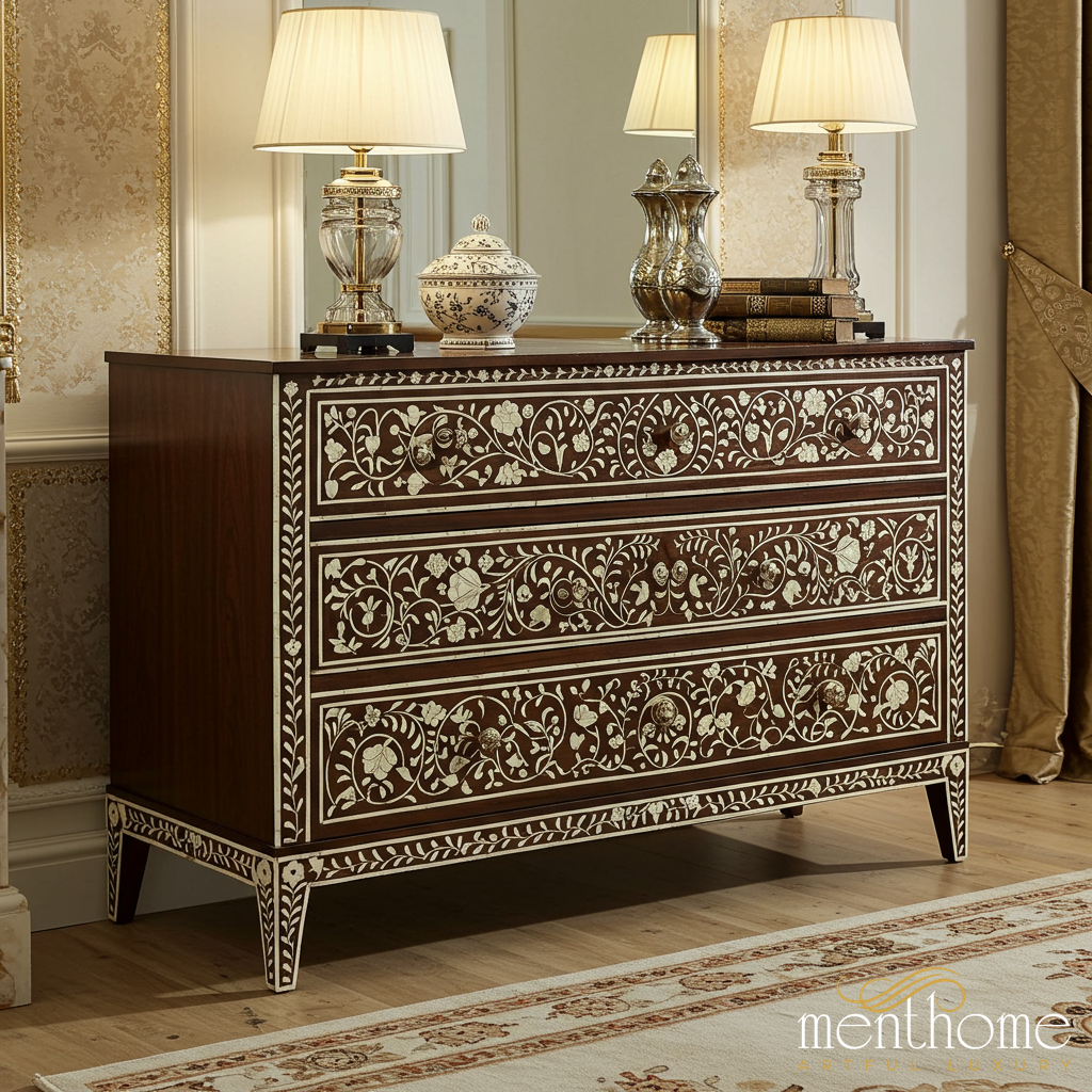 A beautifully crafted wooden chest of drawers featuring intricate floral inlay designs that add a touch of classic elegance to any room. This vintage-style furniture piece combines functionality with ornate artistry, perfect for storing clothes and other essentials while enhancing your home decor.