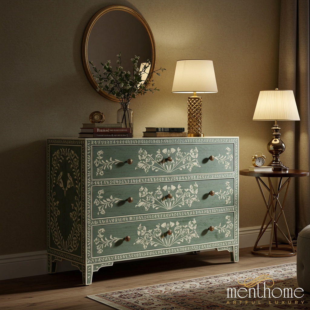 A beautifully crafted vintage wooden chest of drawers featuring an elegant floral pattern in light shades on a muted green background. This piece combines classic style with practical storage, perfect for enhancing your bedroom or living room decor.