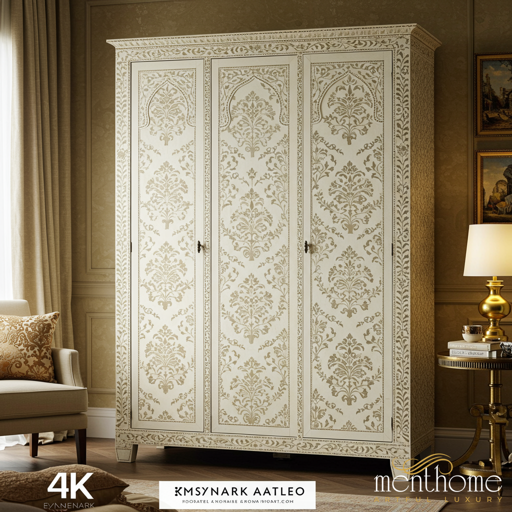 Elegant wooden wardrobe featuring a vintage floral pattern in soft beige tones, offering stylish storage with three spacious doors. Perfect for classic and traditional interiors.