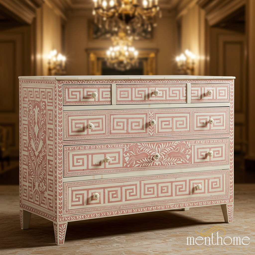 A beautifully crafted wooden dresser featuring a vintage Greek key and floral pattern in soft pink and cream hues. This piece combines functionality with elegant design, making it a perfect addition to traditional, vintage, or eclectic home interiors.