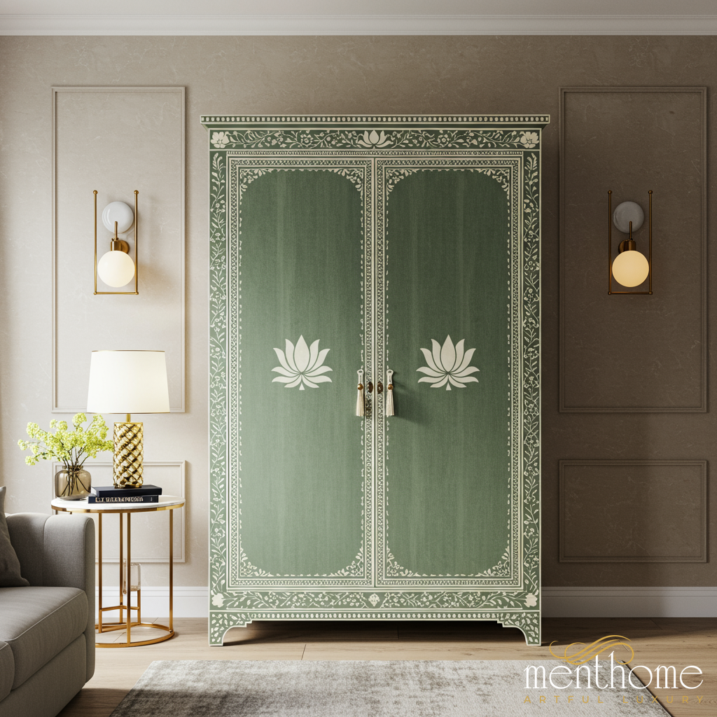 Vintage Green Painted Wooden Armoire with Lotus Motif | Luxury Handmade Wardrobe