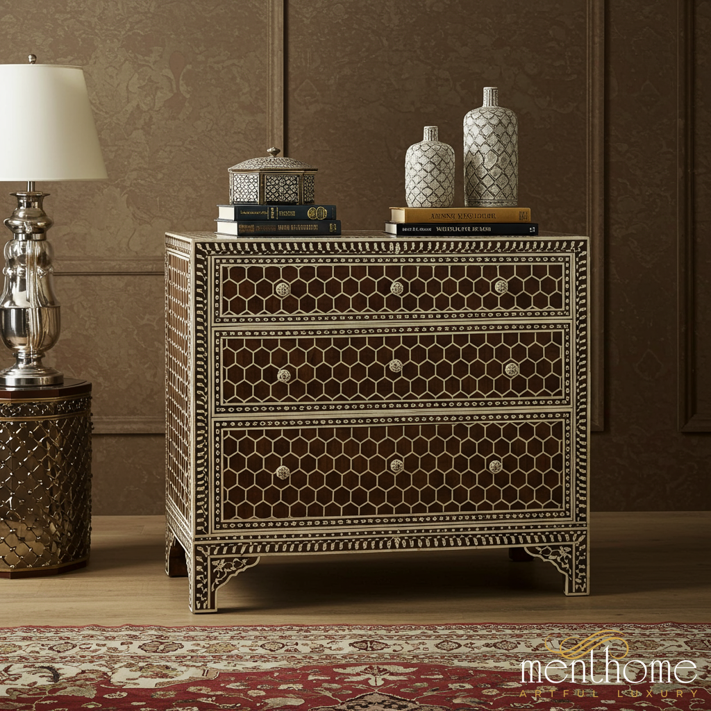 This elegant wooden chest of drawers features a striking honeycomb pattern inlay and a vintage-inspired design. Perfect for adding a touch of sophistication and charm to any living space, it offers ample storage with three spacious drawers.