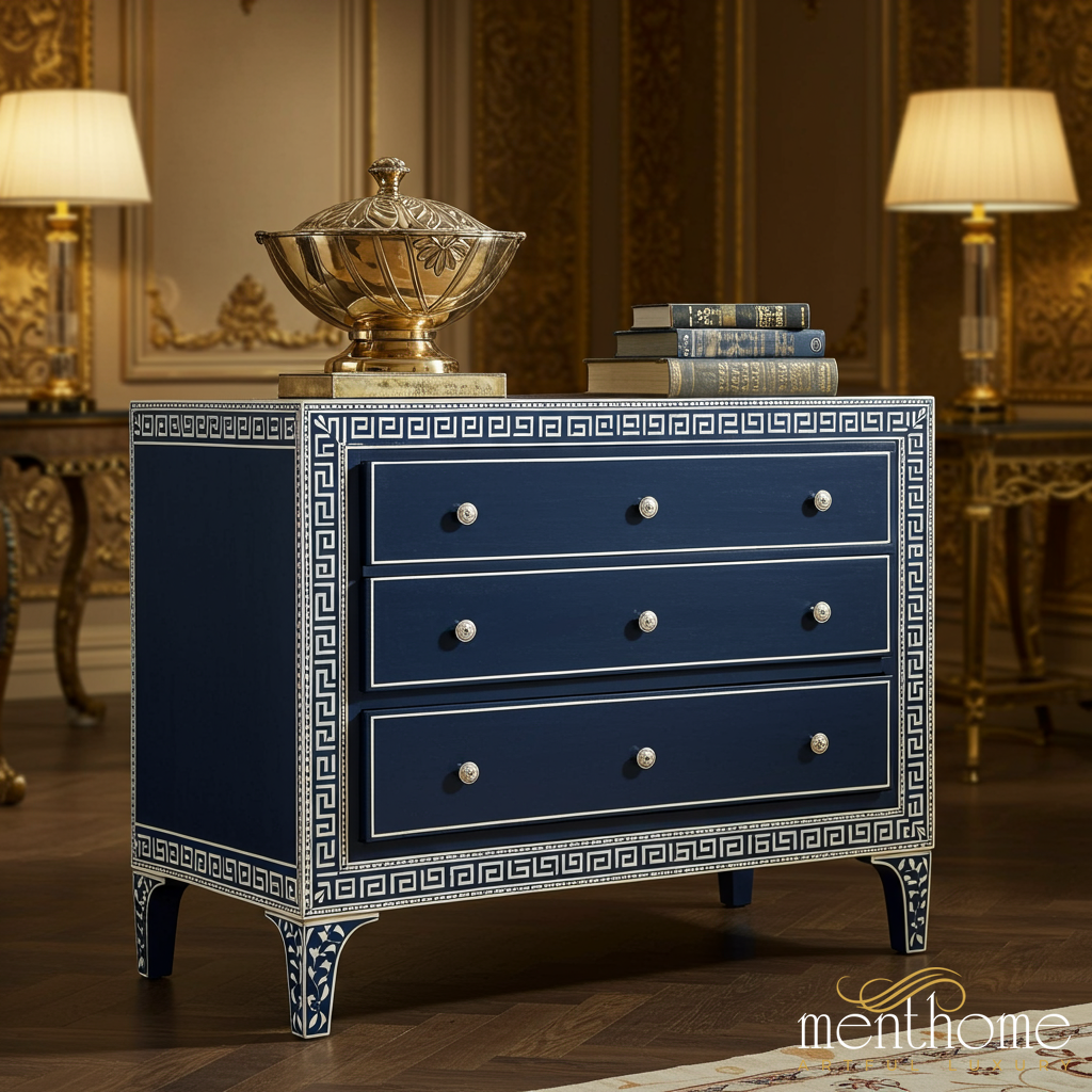 This elegant vintage chest features a sophisticated navy blue finish accented with intricate Greek key patterns in white. Designed with three spacious drawers, the chest offers both functionality and style, making it a perfect addition to classic or contemporary interiors.