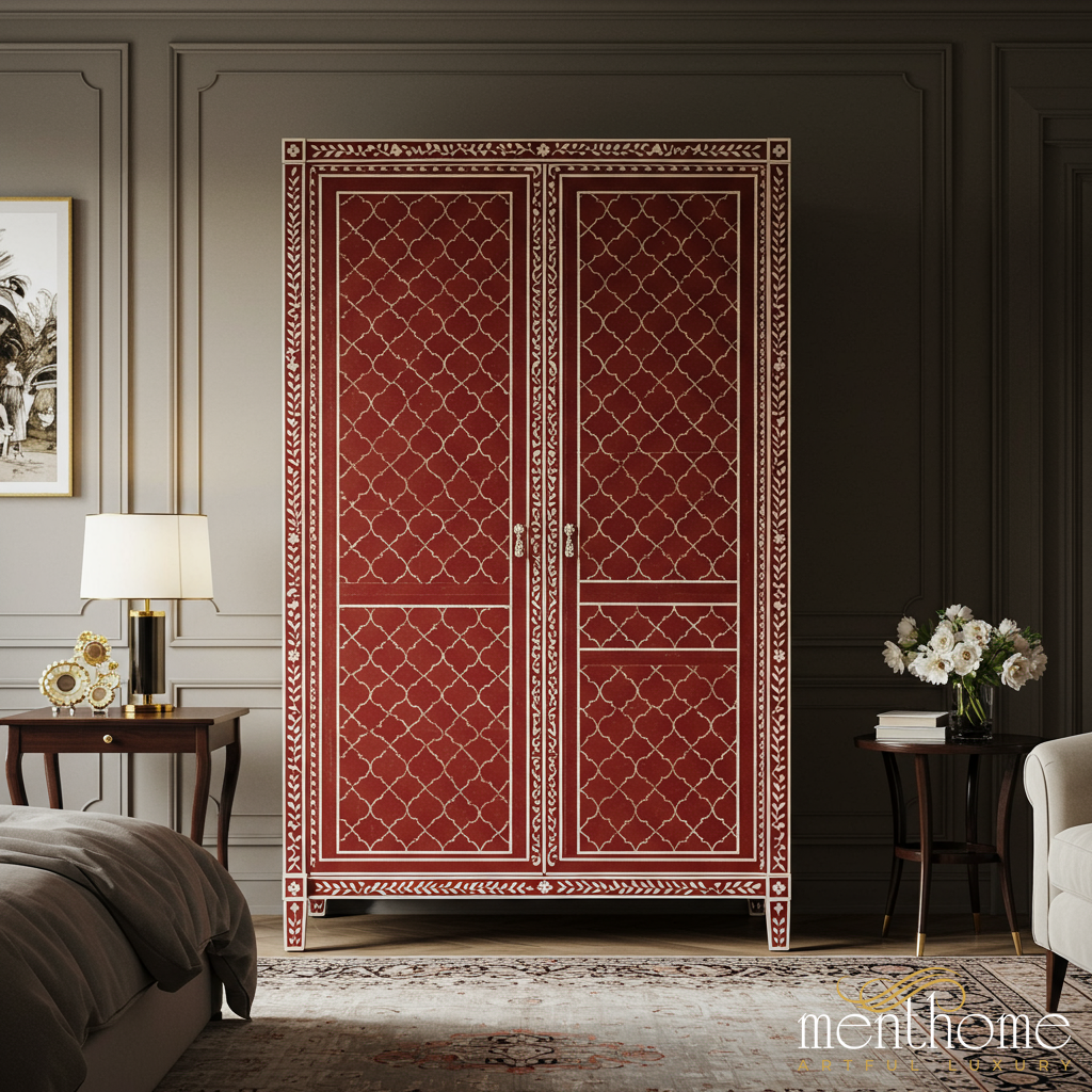 Vintage Red Patterned Wooden Wardrobe | Luxury Handmade Wardrobe
