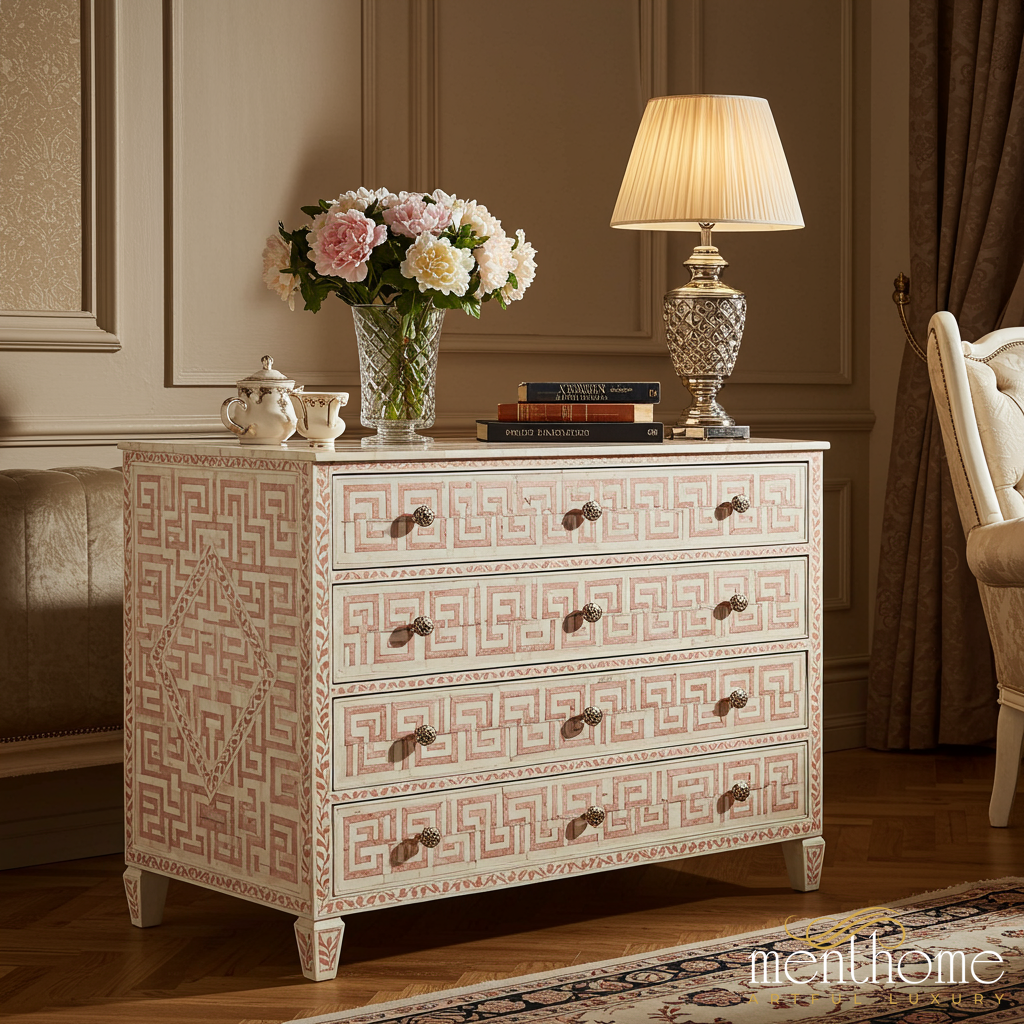 A beautifully crafted vintage style chest of drawers featuring intricate hand-painted patterns in soft beige and rose tones. This elegant storage solution enhances classic and traditional interiors with its detailed design and functional drawers.