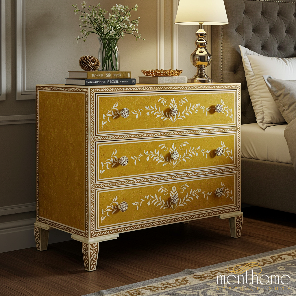 A beautifully crafted vintage-style chest of drawers featuring a yellow finish with intricate white floral patterns and matching ornate drawer knobs. Perfect for adding a touch of elegance to your bedroom or living space.